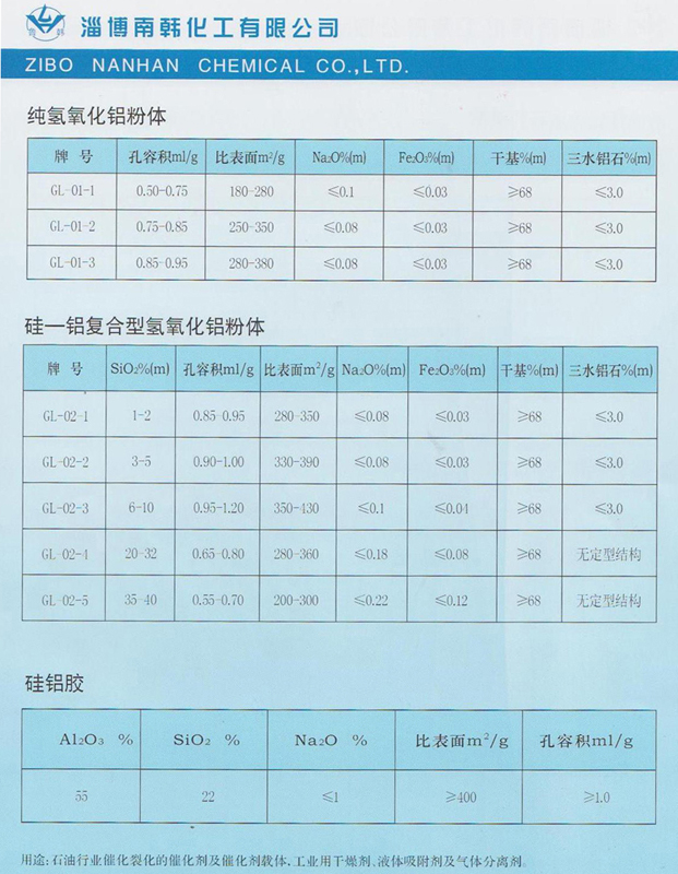 本產(chǎn)品主要用作催化劑載體—活性氧化鋁的原料,如作為加氫催化劑原料以及用作制造加氫催化劑載體、氧氯化催化劑載體等。也可用作分子篩、硅酸鹽耐火纖維制品的成型粘結劑、如作為半合成稀土 Y 型分子篩裂化催化劑的粘結劑。本產(chǎn)品是作各種鋁鹽的良好原料,經(jīng)成型加工后,可作不同形狀的干燥劑、吸附劑和催化劑載體。